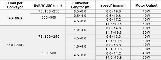 Maximum load & speed varies according to the capacity of the conveyor. |